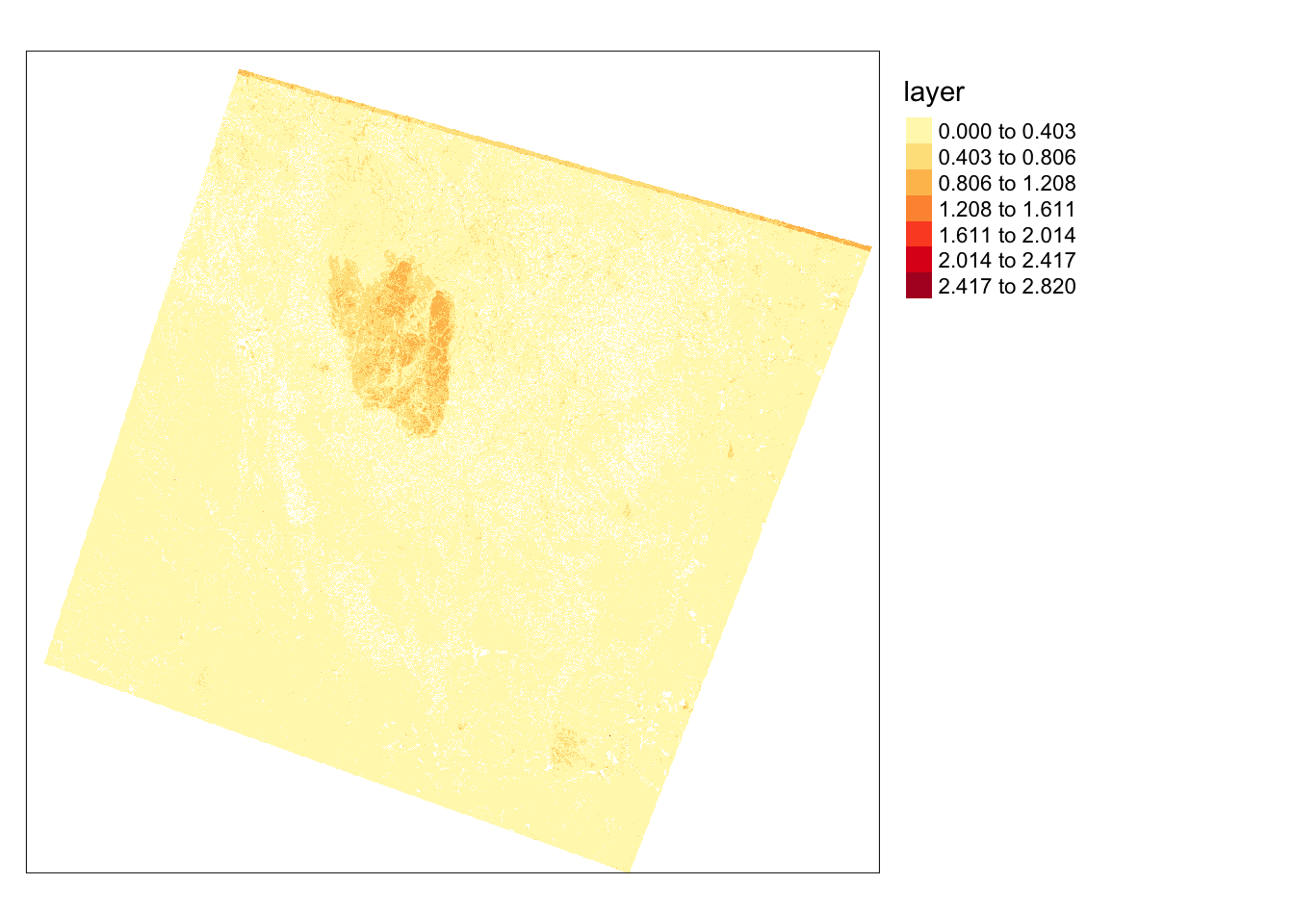 tm_raster(style= "equal", n=7, palette=get_brewer_pal("YlOrRd", n = 7, plot=FALSE))+