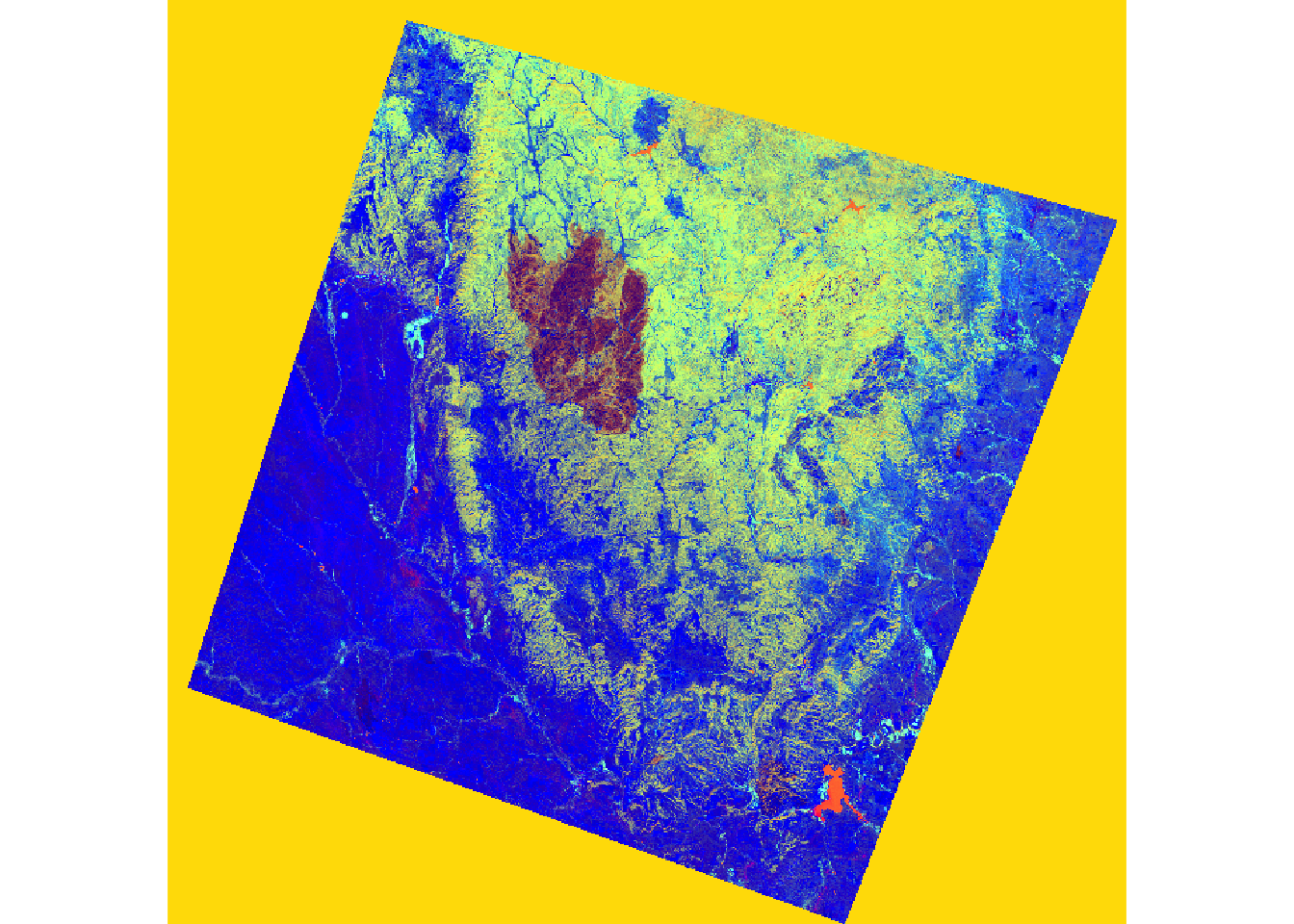 In the subsequent code, I stack the brightness, greenness, and wetness bands and visualize them as a false-color composite. The impact of the fire is evident in the resulting image.